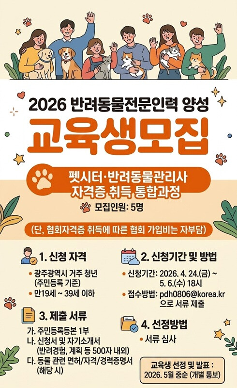 모집 분야는 펫시터·반려동물관리사 자격증 취득 통합 과정과 반려동물행동지도사(2급) 과정, 반려견지도사(2급·3급) 과정 등 3개 교육과정 총 11명이다. 광주시는 실무 중심 교육을 통해 지역 내 급증하는 전문 반려동물 돌봄 수요에 대응할 수 있는 인재를 양성한다.