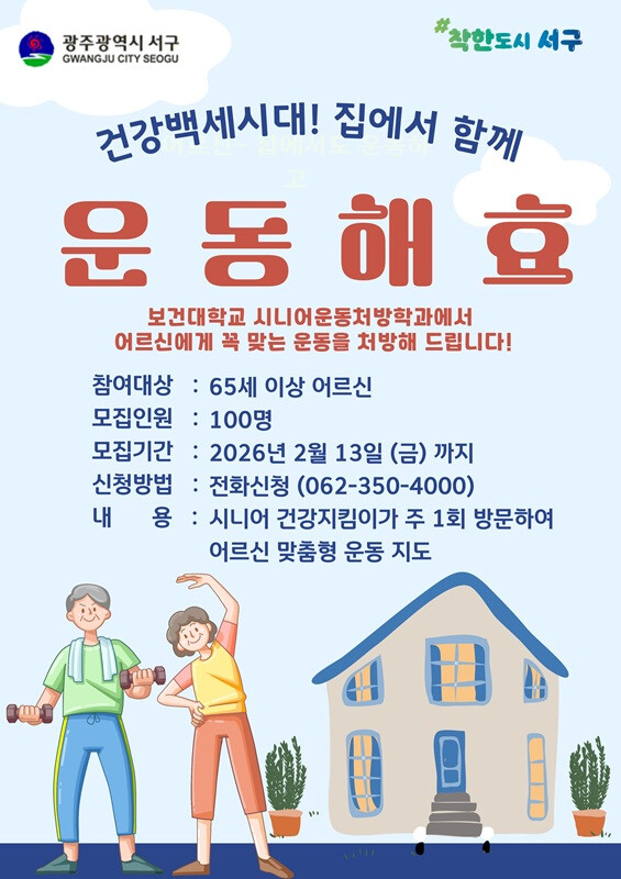 김이강 서구청장은 “이번 운동해효 사업을 통해 어르신들이 가정에서 안전하고 정기적인 운동 지도를 받으며 건강한 노후를 보내시길 바란다”며 “앞으로도 어르신들이 지역사회 안에서 건강하고 행복한 삶을 누릴 수 있도록 다양한 통합돌봄 서비스를 지속적으로 확대하겠다”고 말했다.