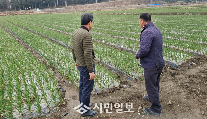 | ▲ 강진군농업기술센터 관계자가 관내 마늘 경작지를 방문해 생육상태를 살펴보고 있다. / 강진군 제공 |
