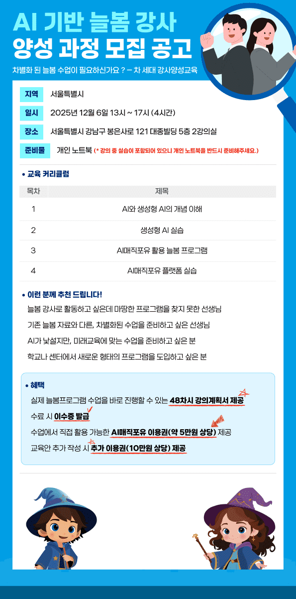 교육 커리큘럼은 다음과 같이 구성된다. ▲ AI·생성형 AI 개념 이해 ▲ 프롬프트 엔지니어링 기초 ▲ 다양한 생성형 AI 서비스 체험 ▲ 프롬프트의 중요성 및 AI 윤리 교육 ▲ AI매직포유 활용 늘봄 수업 이해 ▲ 글쓰기·그림·숏폼·노래·동화 만들기 실습 교육 수료자에게는 실제 늘봄 프로그램 수업을 바로 진행할 수 있는 48차시 강의계획서, 이수증, AI매직포유 이용권(약 5만원 상당)을 제공한다고 한다.
