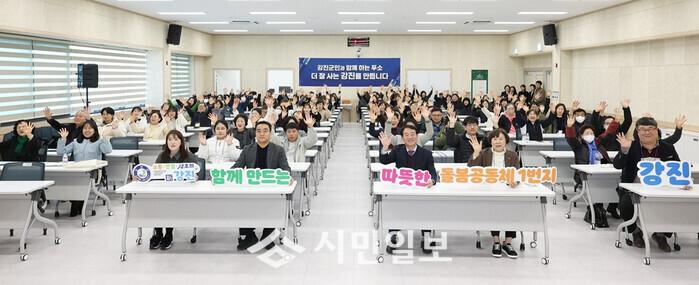 | ▲ 강진원 강진군수(사진 앞줄 가운데)가 지난 12일 강진웰니스푸소센터에서 열린 노인복지시설 및 장기요양기관 종사자 워크숍에 참석해 따뜻한 돌봄공동체 1번지 홍보 퍼포먼스를 하고 있다. / 강진군 제공 |