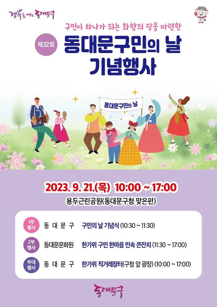 1992년 동대문구민의 날이 제정된 이래로 32번째를 맞이하는 구민의 날 기념행사는 10시 30분부터 용두근린공원에서 개최된다. 자매도시 단체장의 축하메시지 영상 상영, 구민상 시상식, 이필형 동대문구청장의 기념사와 지역 국회의원 및 동대문구의회 의장 등 축사가 예정되어 있으며 구립여성합창단의 축가와 구민의 날 노래 제창 순으로 진행된다.