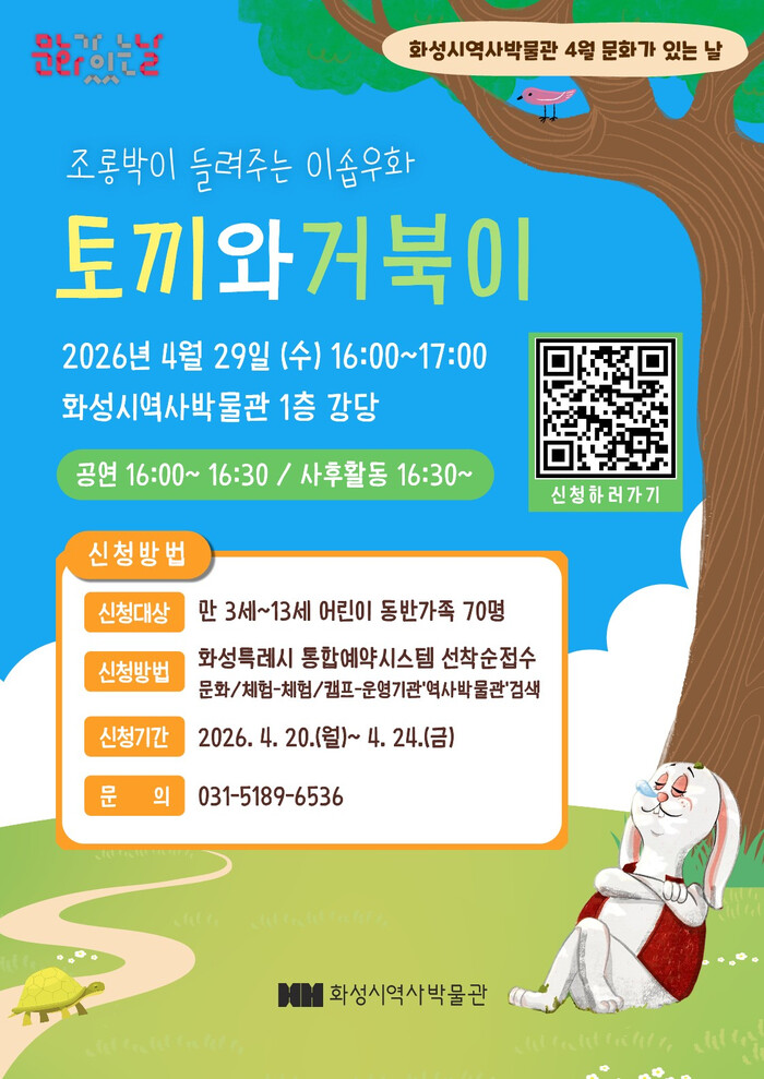 [화성=송윤근 기자] 경기 화성특례시 역사박물관은 오는 4월 29일 ‘문화가 있는 날’을 맞아 어린이와 가족을 위한 체험형 공연 프로그램을 운영한다.