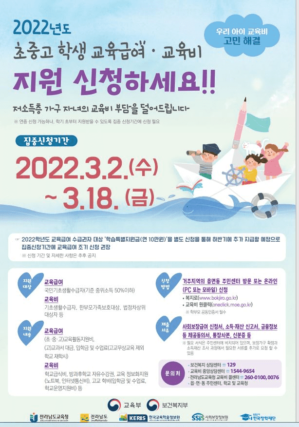 전라남도교육청은 3월 2일(수)부터 3월 18일(금)까지‘초·중·고 학생 교육급여 및 교육비(이하 교육비) 지원’집중 신청 기간을 운영한다고 24일(목) 밝혔다.