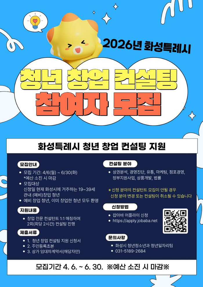 신청 대상은 화성특례시에 주민등록을 둔 19세부터 39세까지의 관내 (예비)창업자로, 온라인 ‘잡아바 어플라이를 통해 신청할 수 있다.