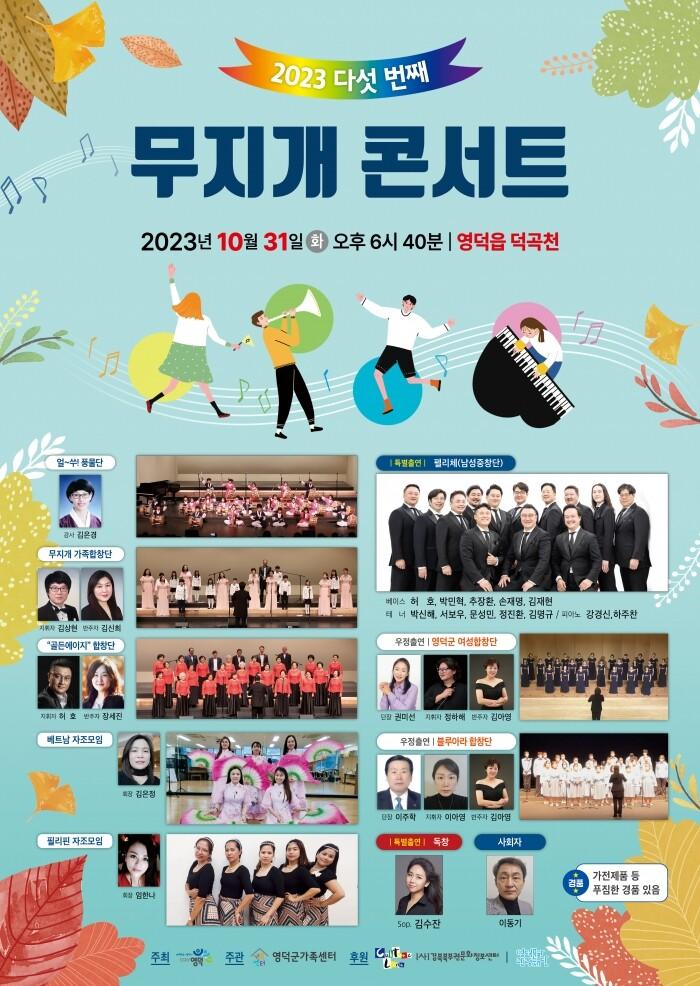 [영덕=박병상 기자]경북 영덕군가족센터(센터장 이안국)에서는 센터 프로그램으로 운영하는 공연팀과 지역 예술인들의 무대로 군민들에게 다양한 문화 향유 욕구를 충족시키기 위해 오는 10월 31일(화) 오후 6시 40분부터 영덕읍 덕곡천에서 “다섯 번째 무지개 콘서트”를 개최한다.