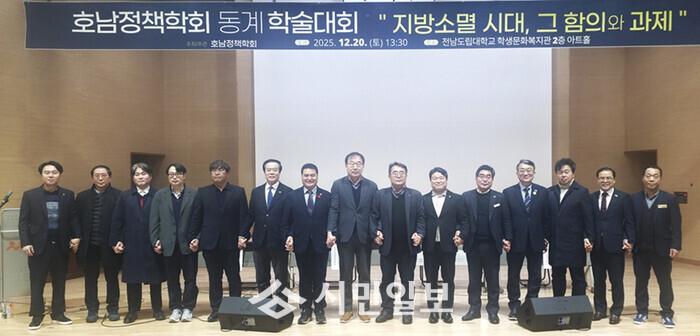 | ▲ 홍기월 광주광역시의원(왼 쪽부터 6번 째)이 지난 20일 전남도립대학교 학생문화복지관 2층 아트홀에서 열린 '2025 호남정책학회 동계 학술대회' 후 참석자 등과 기념촬영을 하고 있다. / 광주광역시의회 제공 |