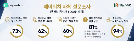 페이워치가 택배업 종사자 1,000명을 대상으로 실시한 자체 설문조사에 따르면, 응답자의 약 80%가 현재 소득 정산 주기에 불편함을 느끼고 있다고 답했으며, 급여 선정산 서비스 이용 의향에 대해서는 94%가 긍정적으로 응답했다.