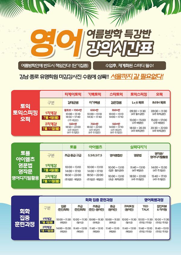 ‘수원시사어학원’의 이번 여름방학특강 할인 이벤트는 토플, 오픽, 토스 시험과 영어회화 집중훈련을 통해 스피킹 능력을 향상시키고자 하는 학생들을 대상으로 실시되며 ‘영어회화집중훈련과정’은 왕기초 입문반부터 프리토킹 수준의 영어회화까지 5단계로 나누어진 체계화된 시스템으로 운영되며 4개월 수강시 2개월 무료수강 및 7개월 수강 시 5개월 무료수강 혜택이 제공된다.