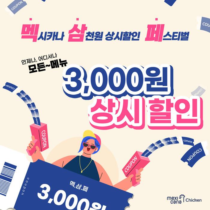 치킨 전문 프랜차이즈 멕시카나가 6월 3일부터 자사앱을 통하여 전메뉴 3천원 할인 프로모션 ‘멕・삼・페’를 전개한다고 밝혔다.