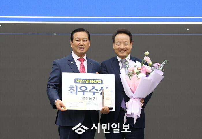 | ▲ 임 택 광주광역시 동구청장(오른 쪽), 26일 충남 보령시 보령머드테마파크 컨벤션관에서 열린 ‘기초 지방정부 우수정책 경진대회’에서 지방소멸대응 분야 최우수상을 수상 한 후 기념촬영 / 광주광역시 동구청 제공. |