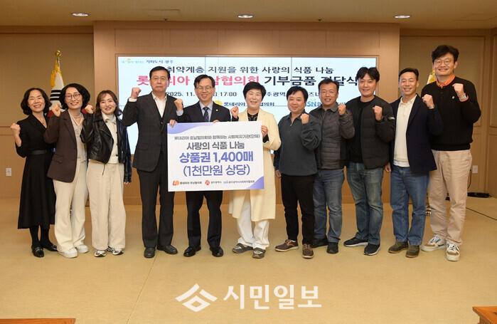 | ▲ 고광완 광주광역시 행정부시장(왼 쪽부터 5번 째)이 27일 오후 시청 비즈니스룸에서 황승희 롯데리아 호남협의회 회장으로부터 취약계층 지원을 위한 기부금품을 전달 받은 후 기념촬영을 하고 있다. /광주광역시 제공 |