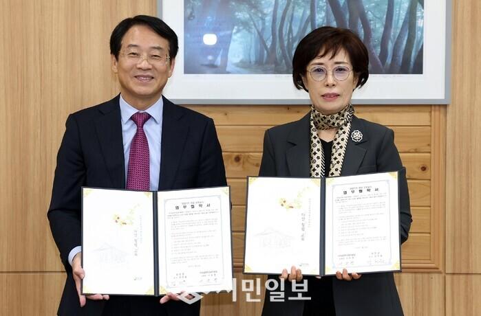 | ▲ 강진원 강진군수(왼 쪽)가 지난 25일 강진군 군수실에서 경기도 구리남양주교육지원청 서은경 교육장과 ’다산청렴교육 업무협약(MOU)’을 체결 한 후 기념촬영을 하고 있다. / 강진군 제공 |