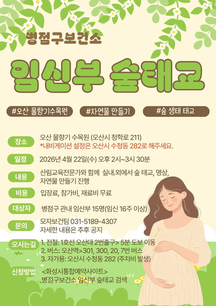 심정식 병점구보건소장은 “숲태교 프로그램은 임신부의 심리적 안정과 태아의 건강한 발달을 함께 도모할 수 있는 의미 있는 프로그램”이라며 “앞으로도 임신부와 영유아를 위한 맞춤형 건강증진 사업을 지속적으로 확대해 나가겠다”고 말했다.