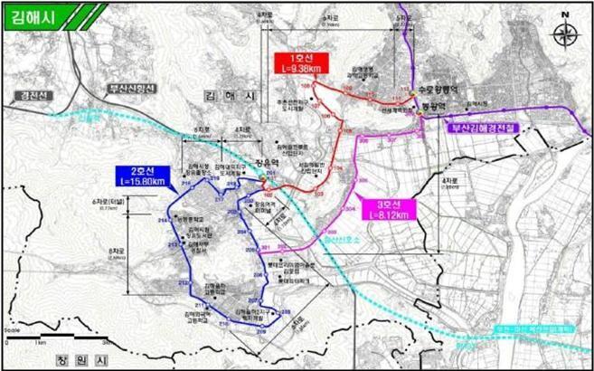 지난 5월 국토부가 창원.김해 각 3개 노선이 포함된 ‘경상남도 도시철도망 구축계획’을 확정‧고시하였고, 김해시 노선으로는 김해시 1호선(장유역∼수로왕릉역 9.38㎞), 2호선(장유역∼율하지구∼장유역 15.8㎞), 3호선(신문동∼봉황역, 8.12㎞)이 선정됐다.