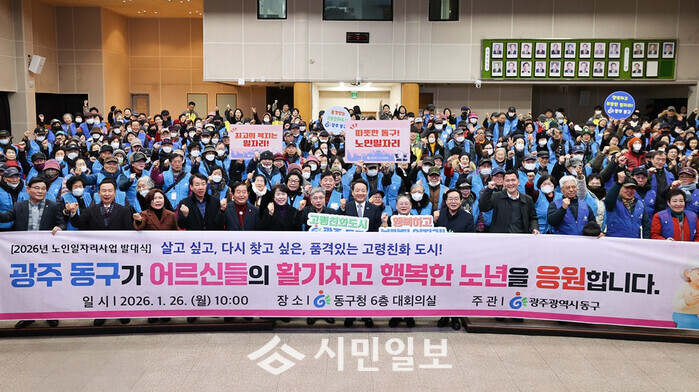 | ▲ 임 택 광주광역시 동구청장(사진 앞줄 가운데)이 지난 26일 동구청 6층 대회의실에서 열린 노인 일자리 발대식에서 참석자 등과 2026넌 힘찬 출발 구호를 외치며 기념촬영을 하고 있다. / 동구청 제공 |