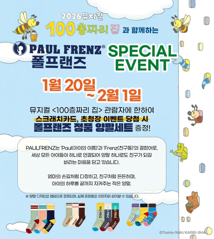 오는 2월 1일까지 ‘폴프랜즈 x 100층짜리 집 브랜드 위크’ 기간으로 운영되며, 공연 현장에서 스크래치 카드 이벤트와 초청장 이벤트를 통해 관람객에게 한정 수량의 폴프랜즈 양말을 증정하는 행사가 진행되고 있다.