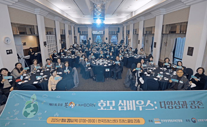 | ▲ 제61회 포럼 본 참가자들이 강연의 주제인 '호모 심비우스'가 적힌 손 팻말을 들고 기념사진을 찍고 있다. (사진=한국양성평등교육진흥원) |