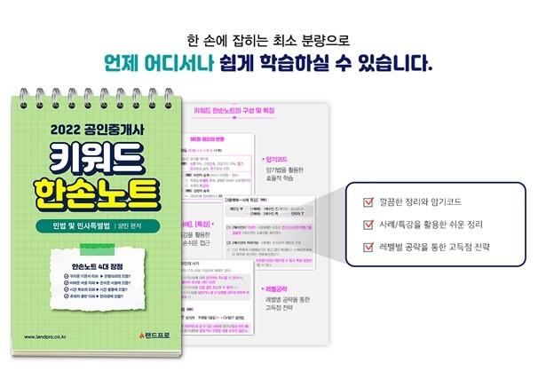 랜드프로 관계자는 “민법 시험과목은 생소한 법 용어와 판례 때문에 초보 수험생들이 많이 어려워하는 과목이기도 하다. 만약 공인중개사 자격증 시험일정에 대비해 1차 과목 민법을 확실히 마무리하길 원한다면, 양민 민법 키워드 한손노트 특강을 추천한다. 교재, 특강 패키지 구매 시 할인 혜택도 누릴 수 있으니, 많은 신청 바란다”고 말했다.