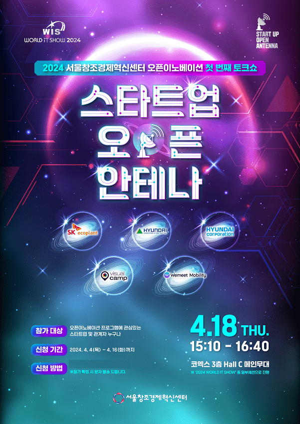 한편, ‘스타트업 오픈 안테나’는 4월 17일~19일 3일 간 코엑스(COEX)에서 개최되는 ‘World IT Show 2024’ 행사의 일환으로 진행된다.