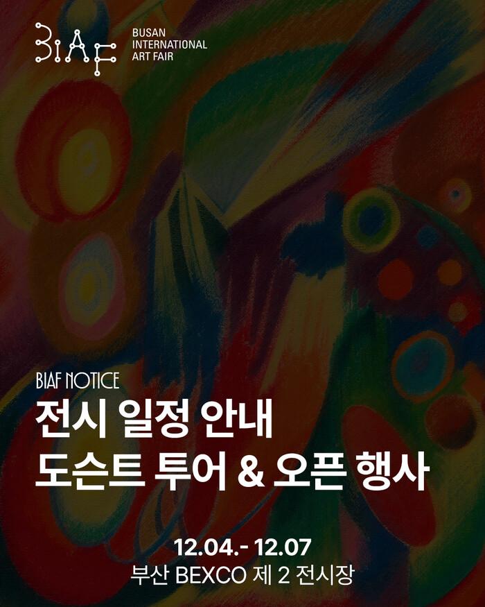 전시 시간은 12월 4일부터 6일까지 오전 10시~오후 7시, 마지막 날인 7일은 오후 5시까지이며, 입장객 누구나 자유롭게 관람이 가능하다. 전시 관람 및 도슨트 투어, 그 외 자세한 사항은 케이아트국제교류협회 홈페이지와 BIAF 홈페이지에서 확인할 수 있다.