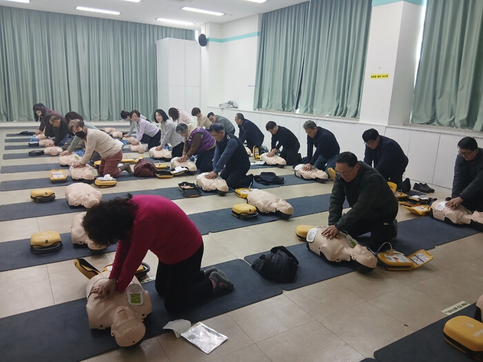 지역 주민 및 관내 사회단체 회원 약 26명은 ▲심폐소생술(CPR) 실습 ▲자동심장충격기(AED) 사용법 ▲화재 발생 시 탈출을 위한 완강기 사용법 ▲지진·연기 대피, 화재 진압 모의 훈련 등을 통해 응급상황 대응 역량을 키웠다.