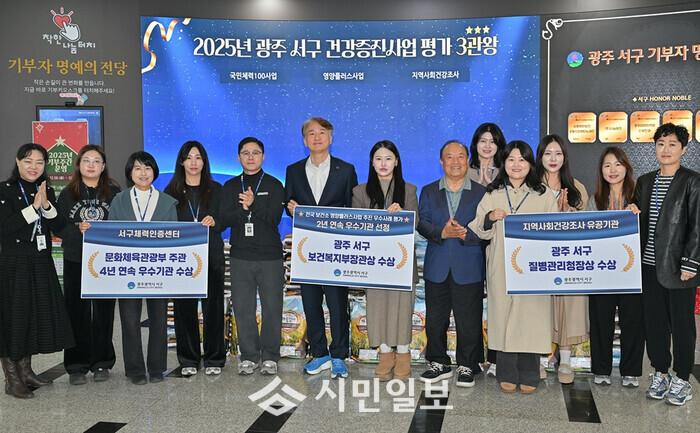 | ▲ 광주광역시 서구청(김이강 서구청장 왼 쪽부터 6번 째), 18일 2025년 국가 단위 주요 보건사업 성과평가에서 3개 분야 우수기관 선정 등 3관왕 달성 기념촬영 / 서구청 제공 |