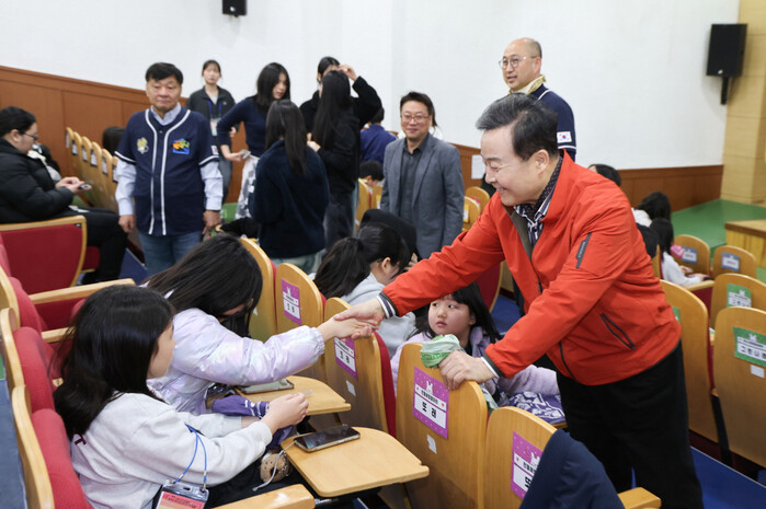 | ▲ 김성제 의왕시장이 2026년 청소년 자치 기구 및 동아리의 출발을 알리는 연합 행사 <팔(8)색조>에서 참석한 어린이와 반갑게 인사를 나누고 있다 /사진제공=의왕시 |