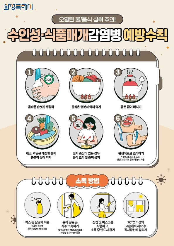 이에 따라 화성특례시 4개 구 보건소는 올바른 손씻기를 비롯 음식은 충분히 익혀 먹기, 물은 끓여 마시기, 채소 과일은 깨끗한 물에 충분히 씻어 먹기, 설사 증상이 있는 경우 음식조리 및 준비 금지, 위생적으로 조리하기 등의 수인성 식품매개 감염병 예방 수직을 안내 했다.