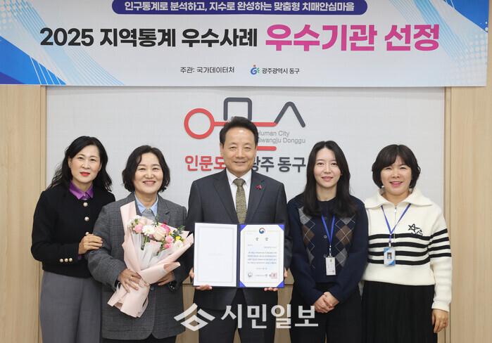 | ▲ 임 택 광주광역시 동구청장(사진 가운데)이 국가데이터처가 주관하는 ‘2025년 지역통계 우수사례 공모전’ 전국 본선 심사에서 ‘인구통계로 분석하고 지수로 완성하는 맞춤형 치매안심마을’ 사례로 우수기관에 선정 돼 관련 실과 직원 등과 기념촬영을 하고 있다. / 동구청 제공 |