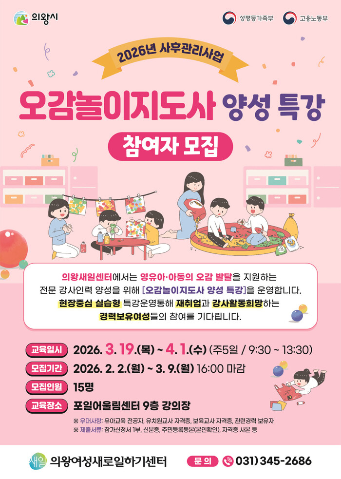 교육 신청은 3월 9일 오후 4시까지 의왕새일센터(의왕고용복지플러스센터 1층)를 방문해 신청서를 제출하면 되며, 최종 교육 대상자는 3월 12일 확정된다.