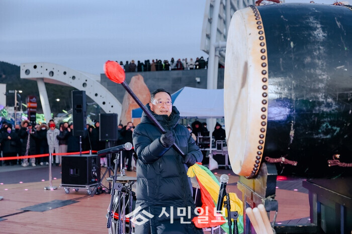 | ▲ 명현관 해남군가 땅끝마을에서 해맞이 대북 타고를 하고 있다. / 해남군 제공 |