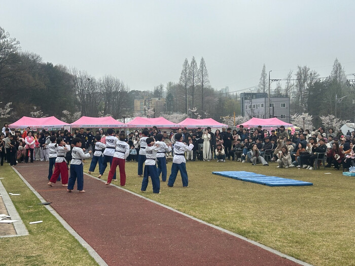 | ▲ 태권도 공연단이 ‘제15회 기배벚꽃축제’에서 힘찬 시범 공연을 선보이며 관람객들의 박수를 받고 있다 /사진제공=화성특례시 |