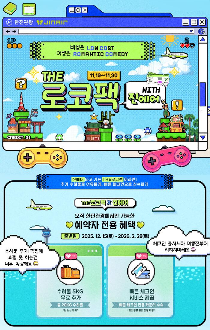 한진관광이 17일부터 진에어와 손잡고 'THE 로코팩 WITH 진에어’ 프로모션을 론칭한다. 이번 프로모션은 본격적인 겨울 여행 시즌을 맞아 합리적인 가격과 프리미엄 서비스를 동시에 누리고 싶은 고객을 겨냥해 기획되었다. 본 프로모션은 오는 11월 19일(수)부터 11월 30일(일)까지 단 12일간 한정 기간 진행된다.