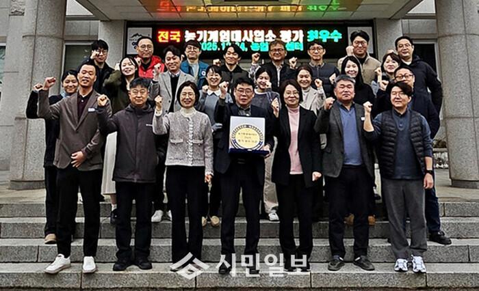 | ▲ 영암군농억기술센터 임직원 등이 지난 20일 농림축산식품부의 ‘2025년 농기계임대사업 종합평가’에서 최우수 등급을 받아 7년 연속 우수기관 선정 기념촬영을 하고 있다. / 영암군 제공 |