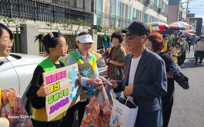 이날 봉사단은 추석 명절을 앞두고 1회용품 소비가 평소보다 늘어나는 시기에 왕후시장 이용객들에게 장바구니 200개를 나눠드리며 일회용품 사용을 근절하고 장바구니 사용을 독려했다.