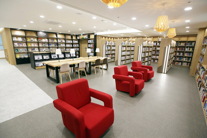 특히, 기존의 높은 밀집 서가로 인해 좁고 어두운 공간을 개방형의 낮은 서가와 세련된 테이블·소파 등을 배치해 개선하고, 여기에 격자 천장·조명 시공을 더해 밝고 현대적인 분위기의 도서관으로 탈바꿈시켰다.