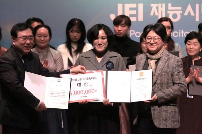 | ▲ 성인부 대상 수상자 신은자씨(가운데), 백규태 재능교육 대표(왼쪽), 고두현 한국시인협회 부회장(오른쪽).(사진=재능교육 제공) |