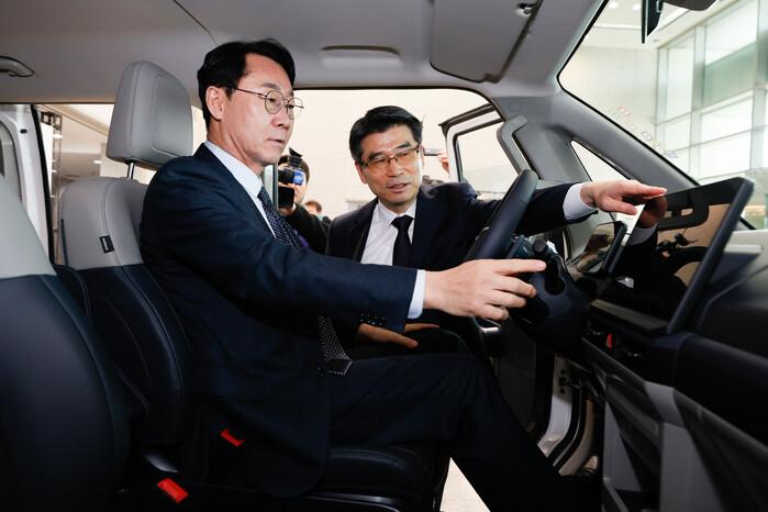 | ▲ 정명근 화성특례시장이 기아 PBV 기반 미래 모빌리티 생태계 조성을 위한 투자 및 업무협약식에서 차를 시승하고 있다 /사진제공=화성특례시 |