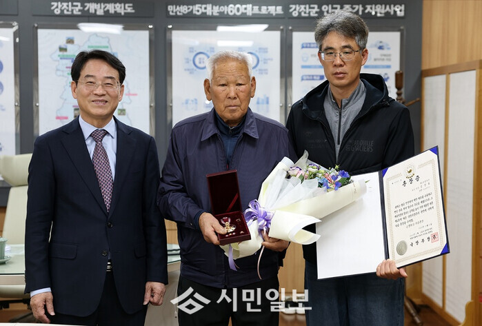 | ▲ 강진원 강진군수(왼 쪽)가 지난 25일 6.25참전유공자 유족에게 화랑무공훈장을 전달 한 후 기념촬영을 하고 있다. / 강진군 제공 |