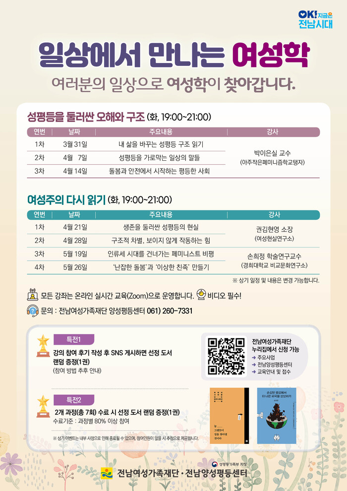 성혜란 전남여성가족재단 원장은 “여성학 전문과정을 아껴주신 도민 여러분 덕분에 더욱 친숙하고 실천적인 모습으로 변화할 수 있었다”며 “이번 강좌가 일상의 다양한 문제를 여성주의 관점에서 바라보고 지역사회가 서로의 다양성을 존중하는 평등한 공동체로 나아가는 계기가 되길 기대한다”고 밝혔다.