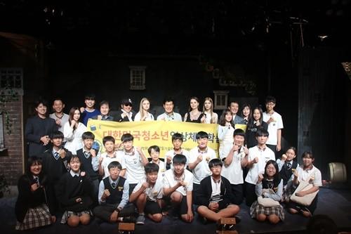 | ▲ 에버시네마의 청소년 영상체험학습전에 출연한 해설사와 학생들이 즐거워하고 있다. |
