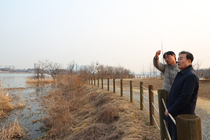 이날 김 시장은 왕송호수공원의 생태탐방로와 생태습지, 주요 산책로 등을 직접 이동하며 호수 수질 상태와 동식물 서식 환경 등을 살폈다. 또한, 공원 방문객이 증가하는 봄철을 맞아 공원시설물의 관리 상태를 꼼꼼히 확인했다.