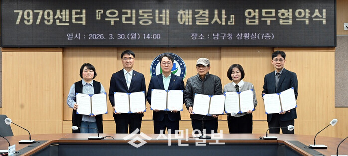 | ▲ 광주광역시 남구, 우리동네 해결사 사업 참여 철물 취급업소 5곳 대표와 업무협약 체결 후 기념촬영 / 남구 제공 |