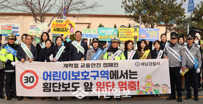 이날 캠페인은 해남경찰서장을 비롯해 해남군수, 교육장 등 유관기관과 녹색어머니회, 모범운전자회 등 70여 명이 함께 참여해 등굣길 어린이들의 안전한 보행환경 조성을 위한 홍보 활동을 펼쳤다.