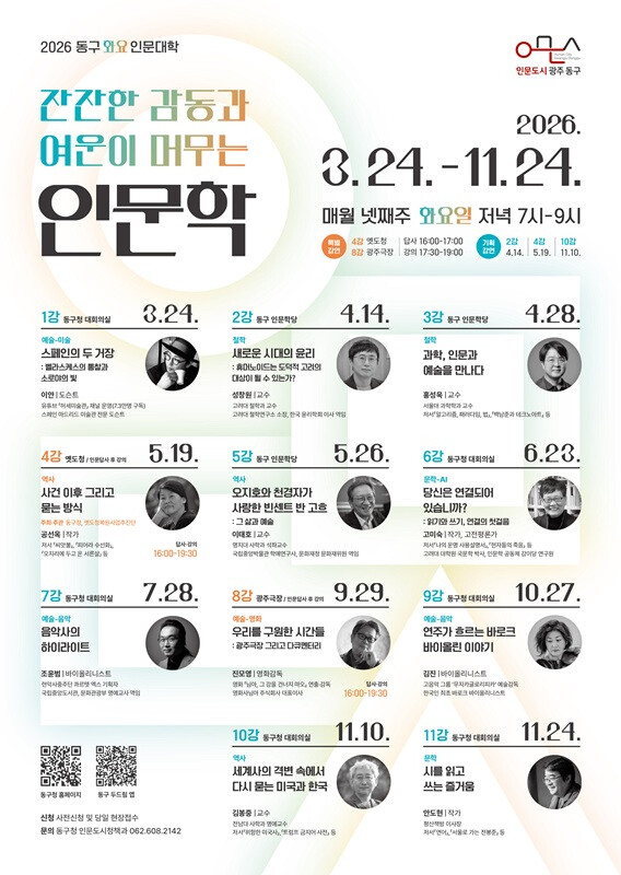 올해로 8년째를 맞는 동구 인문대학은 운영 요일을 화요일로 변경해 매월 넷째주 화요일에 진행되며, 첫 강의는 24일 오후 7시부터 9시까지 동구청 대회의실에서 열린다.
