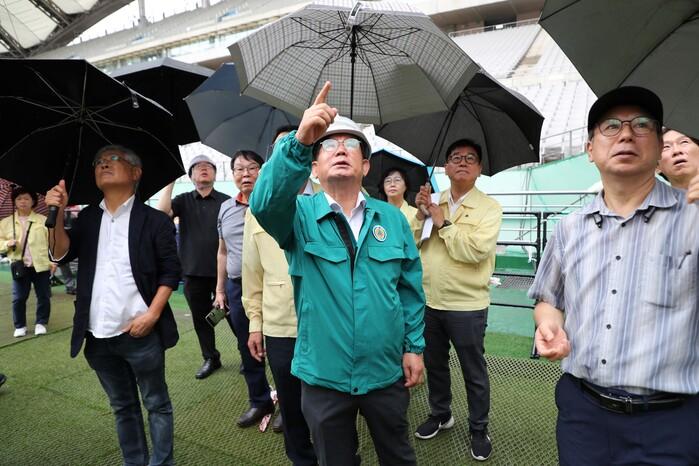 | ▲ 10일 서울월드컵경기장에서 박강수 구청장(가운데)과 민간전문가 등 관련자들이 잼버리 폐영식 행사 무대시설 설치현황을 합동점검 하고 있다. (사진=마포구청 제공) |