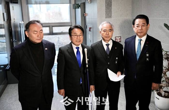| ▲ 강기정 광주광역시장이 27일 국회의원회관에서 열린 ‘광주전남 통합 특별법 검토 시도지사-국회의원 4차 조찬간담회’를 마치고 특별시 명칭과 주소지에 대한 결정사항을 발표하고 있다. (사진 왼쪽부터 김원이 민주당 전남도당 위원장, 강기정 광주시장, 양부남 민주당 광주시당 위원장, 김영록 전남지사)/광주광역시 제공 |