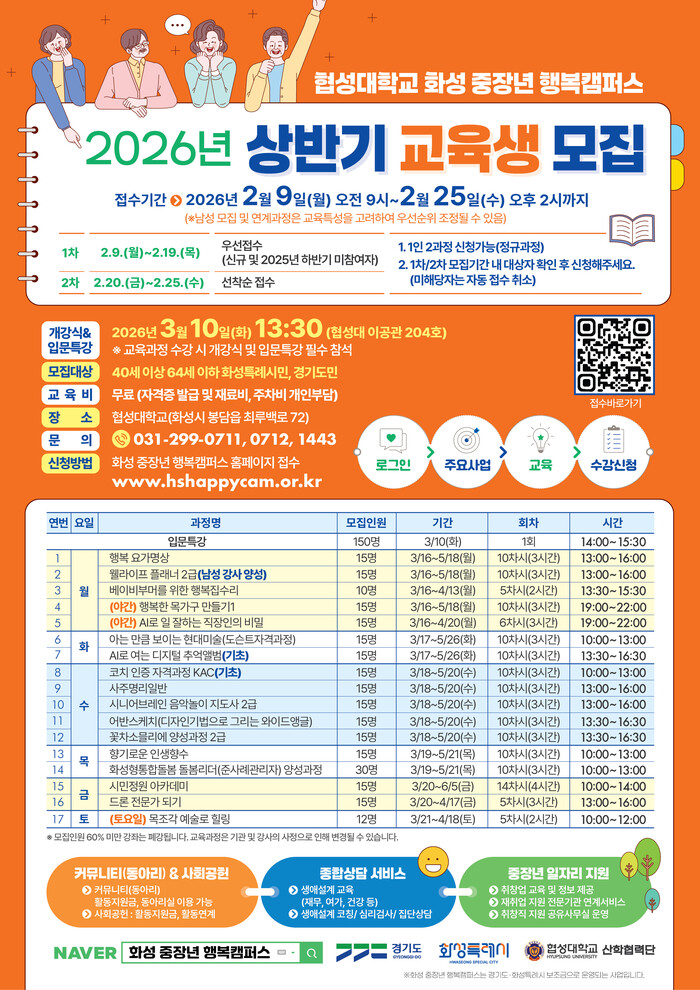 교육은 협성대학교(화성시 봉담읍 최루백로 72)에서 진행되며, 신청은 화성 중장년 행복캠퍼스 홈페이지를 통해 가능하다.
