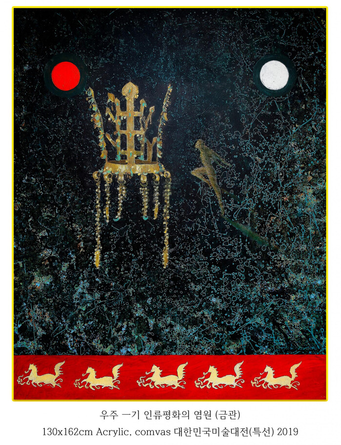 대표 작품은 2019 대한민국미술대전 특선 수상작 〈우주-기 인류 평화의 염원(금관)〉이다. 이 작품은 삼국시대 도안과 유물에서 착안한 색채와 문양을 현대적으로 재해석해, 신라 황금관을 모티브로 삼았다. 우리나라 건국 이념인 ‘홍익인간’ 사상을 우주적 기원과 연결해, 금관이 인류 평화를 떠받치는 형상으로 표현한 것이 특징이다. 해외 전시에서도 호평을 받은 작품으로 알려져 있다.